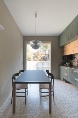 Un elemento chiave è la connessione con l’esterno: la cucina si apre su un balcone, collegato a un terrazzo riqualificato tramite una passerella sospesa, massimizzando la fruizione degli spazi aperti.