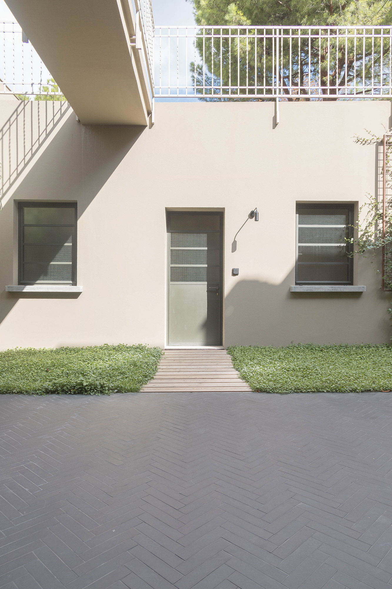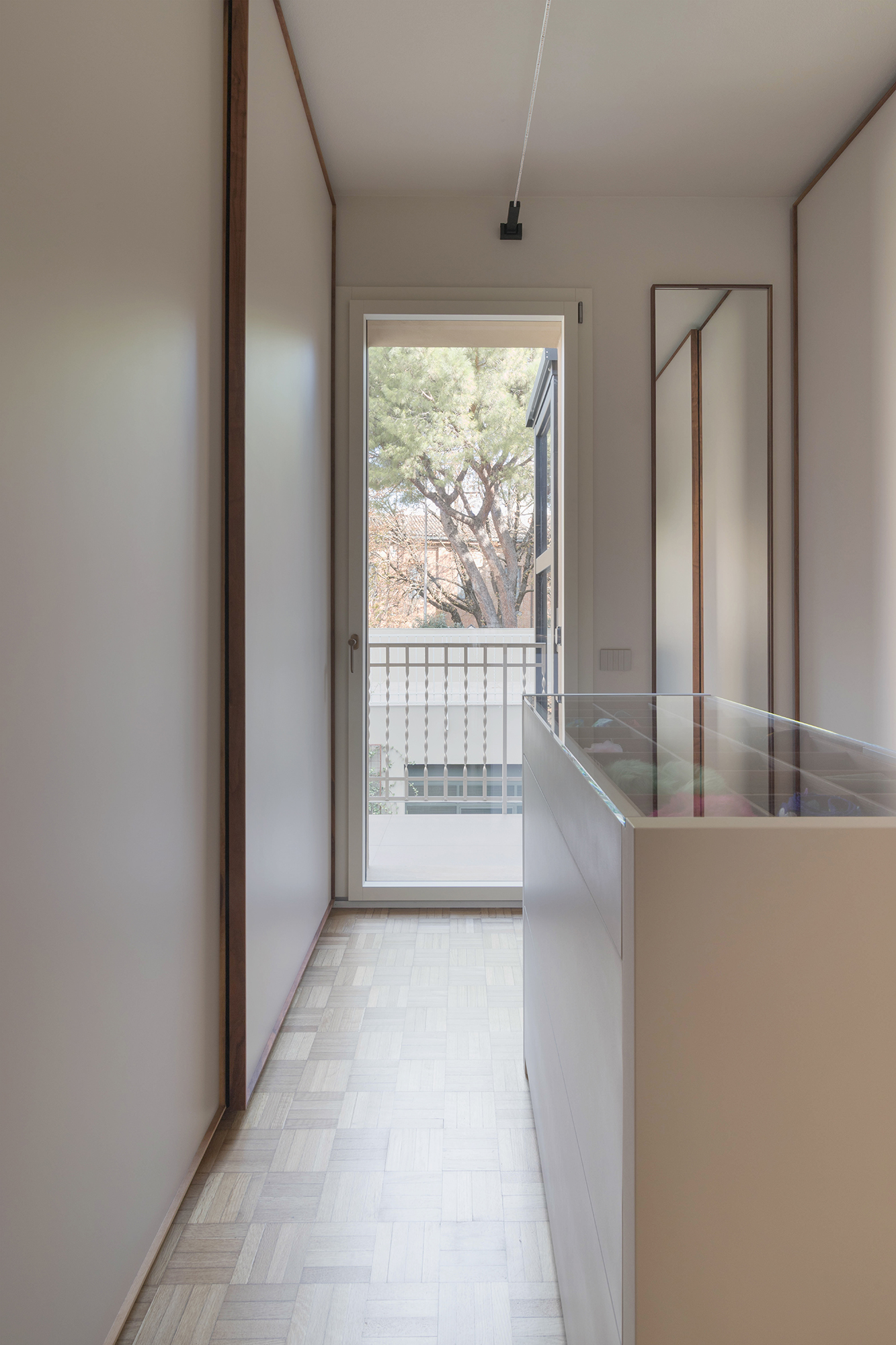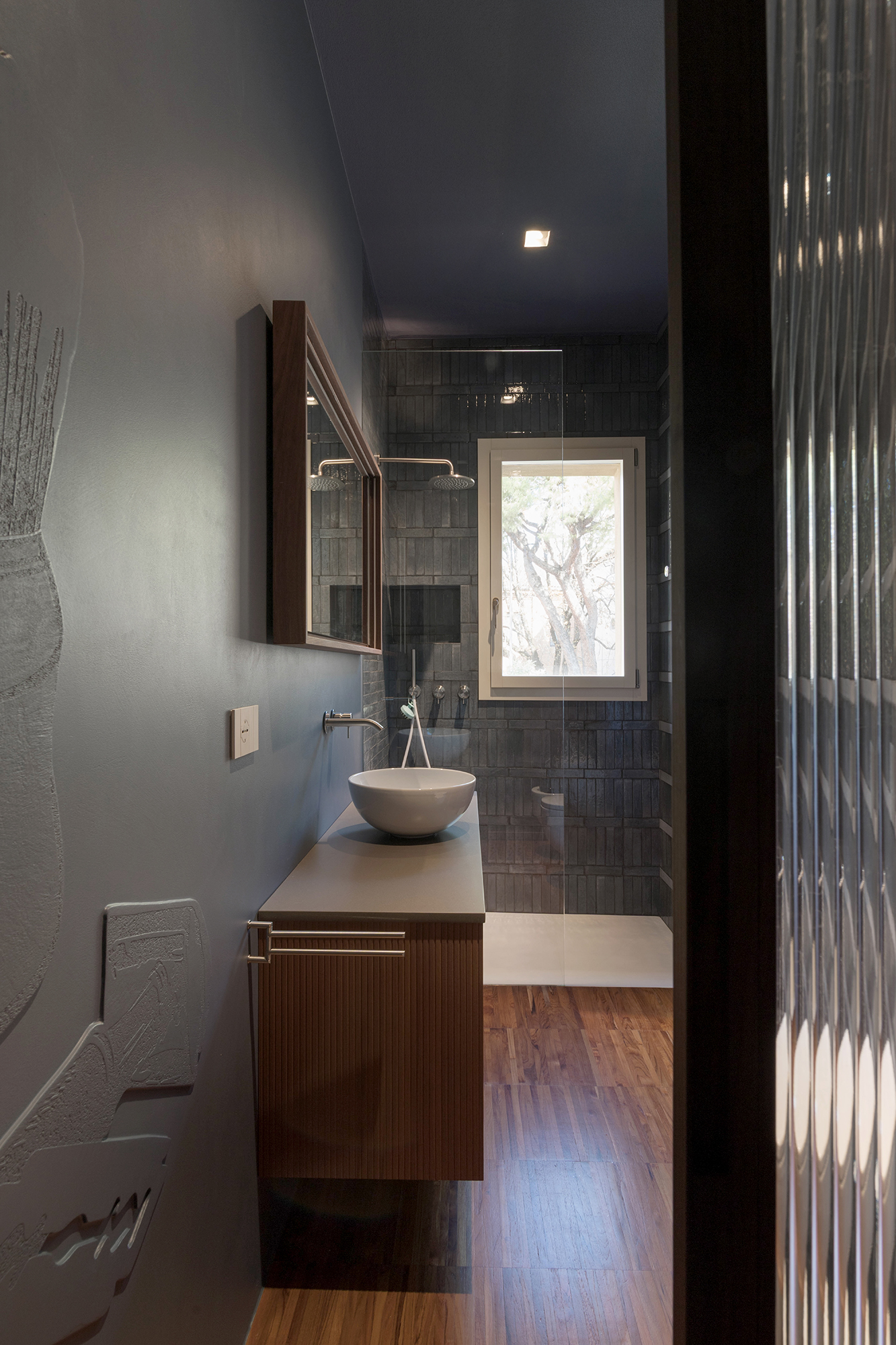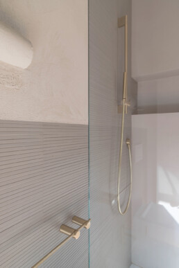 Il design è caratterizzato dalla ricerca dell’invisibilità e purezza delle linee: infissi esterni minimali e “invisibili” con scuri alla padovana. Porte interne a raso muro che si mimetizzano nelle pareti, con maniglie in ottone ossidato in evidenza.