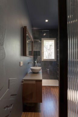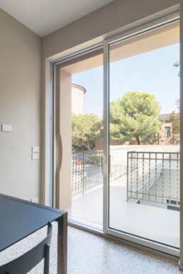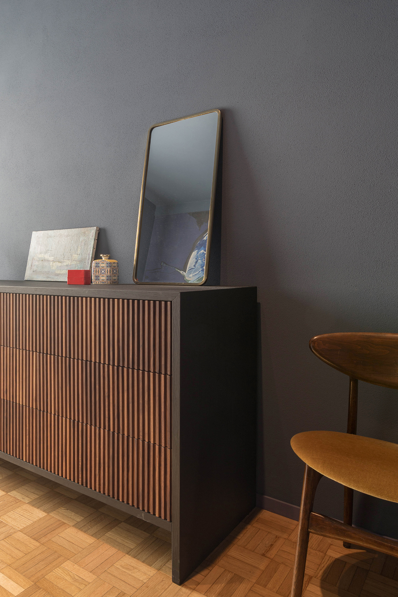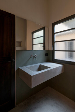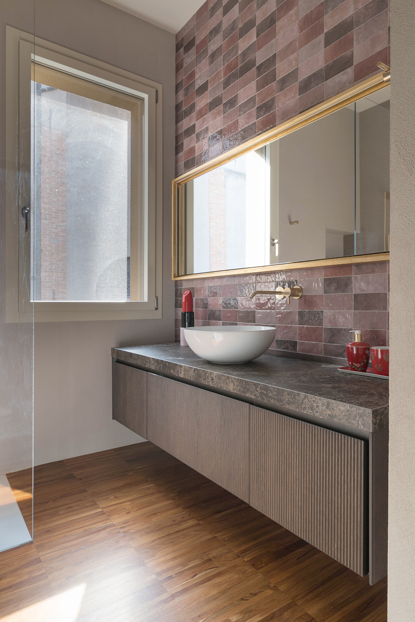 Il design è caratterizzato dalla ricerca dell’invisibilità e purezza delle linee: infissi esterni minimali e “invisibili” con scuri alla padovana. Porte interne a raso muro che si mimetizzano nelle pareti, con maniglie in ottone ossidato in evidenza.