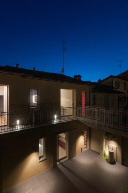 La forza del progetto risiede nell’elevato numero di arredi realizzati su disegno (cucina, mobili della zona giorno, armadi, cassettone e porte interne strategiche), assicurando un’identità unica. L’intervento include anche un’importante riqualificazione del cortile, con manufatti in cemento e infissi metallici customizzati, realizzati da artigiani locali.