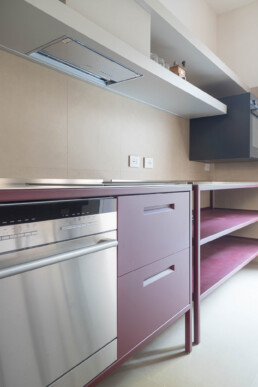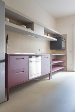 Realizzata su nostro progetto da artigiani locali, la cucina è composta da elementi su misura che coniugano robustezza ed elegante minimalismo. La struttura metallica e i frontali bordeaux si armonizzano con il piano in acciaio inox, definendo un design solido. L’impostazione basata su moduli autonomi e l’eliminazione dei pensili superiori donano ariosità. L’uso sapiente di volumi sospesi bilancia funzionalità e impatto visivo leggero. Il risultato è un arredo essenziale, informale e da una spiccata personalità, dove la precisione costruttiva celebra la cura del dettaglio.