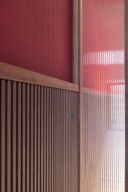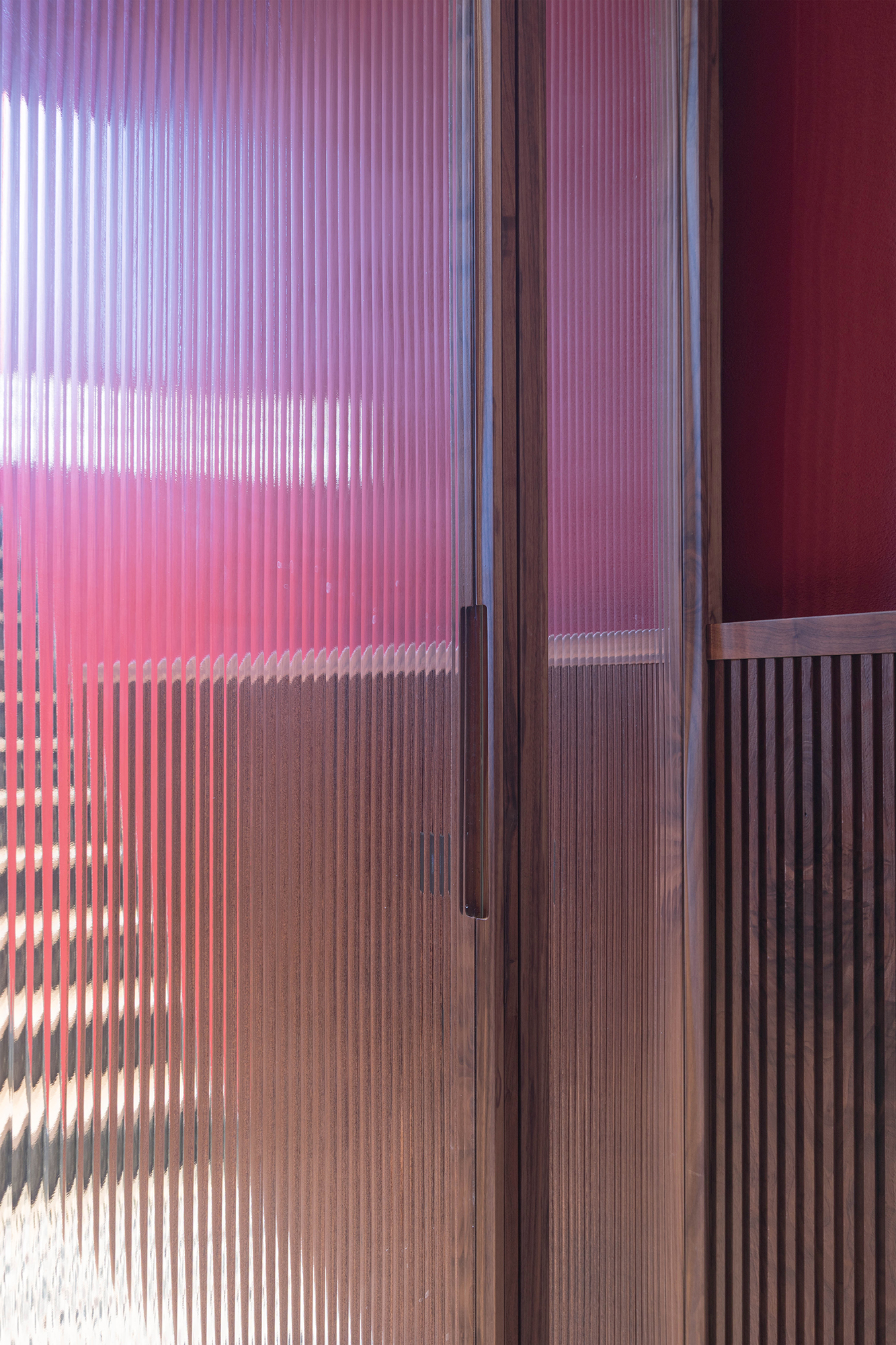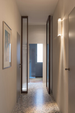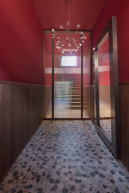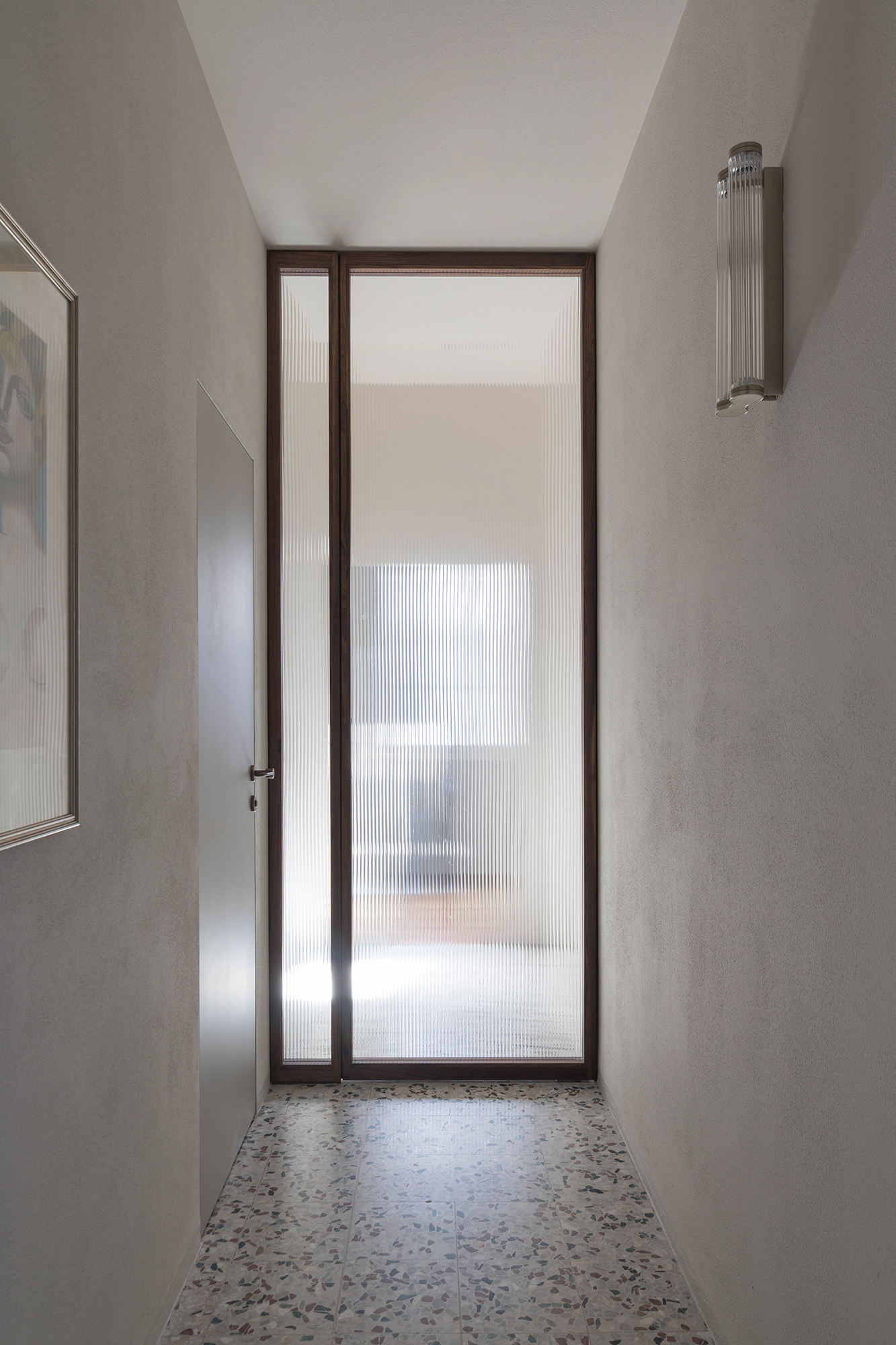 Progettata per definire e dividere gli accessi tra piano terra e piano primo, questa soluzione assolve pienamente alla sua funzione pratica pur mantenendo un’estetica di forte impatto visivo e di estrema armonia. La struttura è composta da due pannelli fissi e un pannello pivotante con molla di ritorno, tutti realizzati con profili in noce canaletto massello che incorniciano i cristalli fluted temperati, i quali, filtrando la luce, amplificano la percezione dello spazio.