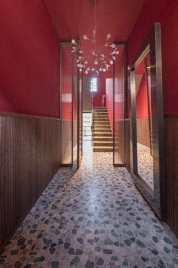 In continuità con la chiusura verticale, la boiserie, anch’essa in noce canaletto massello cannettato, conferisce unità e coerenza all’intero ambiente. Ne risulta un elemento d’arredo architettonico capace di accogliere e introdurre gli spazi interni con ricercata eleganza.