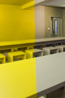 Il progetto consisteva in un intervento pittorico caratterizzato da aree cromatiche, principalmente gialle e grigie. Queste aree hanno coinvolto indistintamente sia la struttura architettonica sia gli arredi, creando un continuum spaziotemporale che ha rappresentato il fulcro dell’iniziativa.