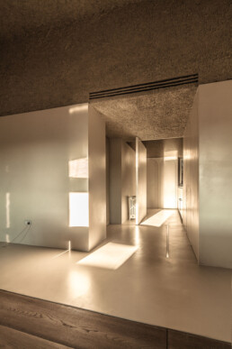 L’impianto edilizio preesistente è stato completamente integrato con nuove soluzioni di arredo espositivo e una rinnovata visione estetica. L’intervento di re-fresh delle superfici ha incluso l’applicazione di un intonachino a calce dalle tonalità calde, caratterizzato da una finitura “schiacciata e strappata” che dona morbidezza alle murature perimetrali. Il focus è stato posto sulla grande parete centrale, avvolta da un rivestimento materico unico: garze di tela grezza imbevute in collanti e pigmenti terrosi e bituminosi, creando un effetto finale di forte impatto visivo e scultoreo.