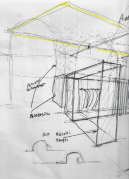 L’impianto edilizio preesistente è stato completamente integrato con nuove soluzioni di arredo espositivo e una rinnovata visione estetica. L’intervento di re-fresh delle superfici ha incluso l’applicazione di un intonachino a calce dalle tonalità calde, caratterizzato da una finitura “schiacciata e strappata” che dona morbidezza alle murature perimetrali. Il focus è stato posto sulla grande parete centrale, avvolta da un rivestimento materico unico: garze di tela grezza imbevute in collanti e pigmenti terrosi e bituminosi, creando un effetto finale di forte impatto visivo e scultoreo.