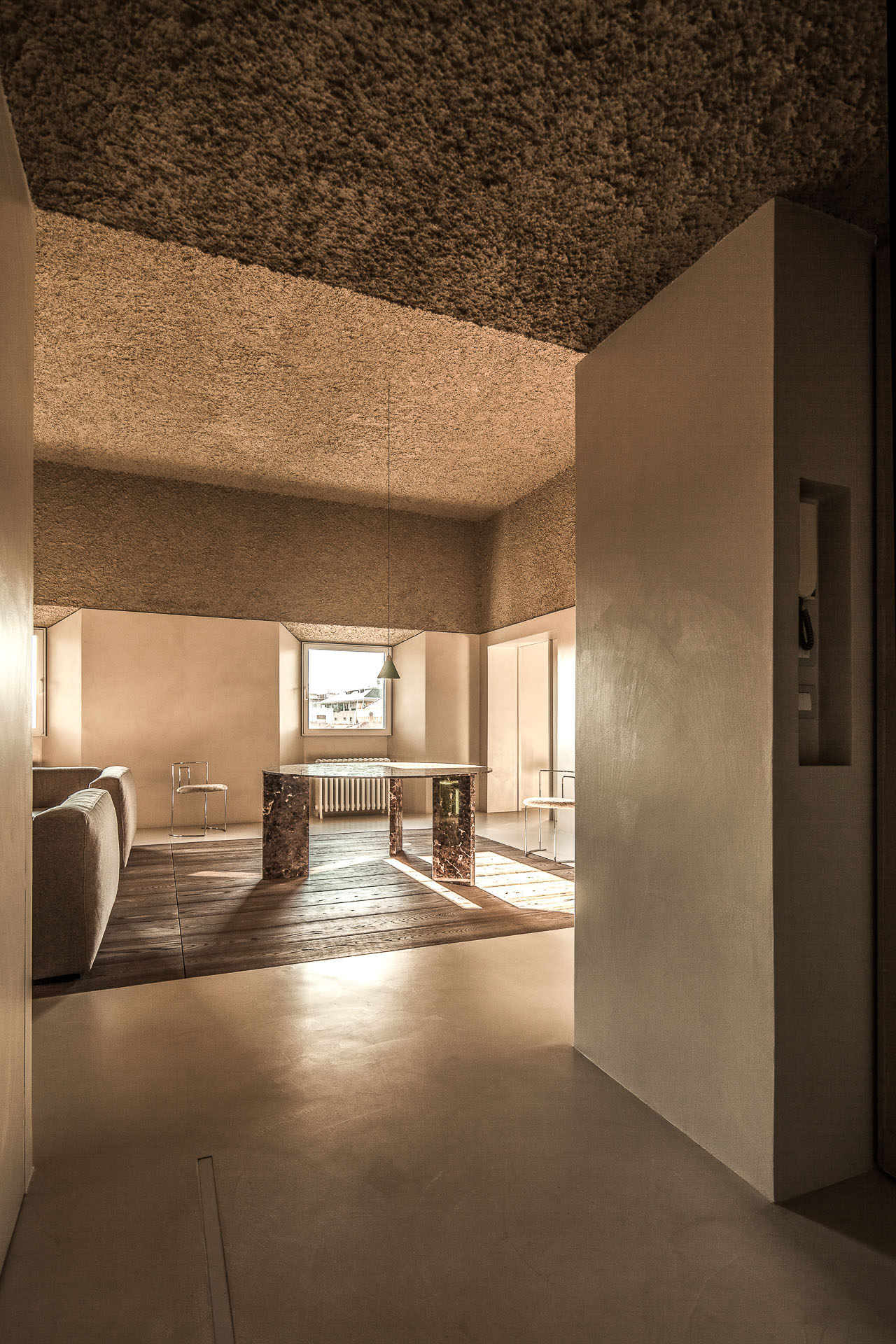 La scelta progettuale di elementi diversi e contrastanti trova la sua unità compositiva nella morbidezza dell’ambiente, definito da colori scuri e materiali caldi. L’intero progetto è volutamente caratterizzato da una rigorosa padronanza dell’uso della luce, intesa e utilizzata non come semplice illuminazione, ma come vera e propria materia da costruzione dello spazio.