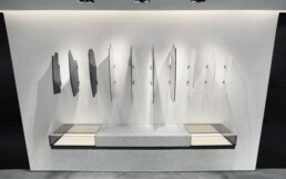Il design degli arredi è stato concepito per instaurare un ritmo armonico lungo la parete principale che accoglie l’ingresso, dialogando fluidamente con il resto dello spazio espositivo. Gli elementi sono scanditi da una ripetitività irregolare di elementi obliqui in metallo che si intersecano con una maglia più regolare di contenitori in legno, ottimizzando la presentazione del prodotto. L’intervento è completato da due grandi pannelli decorati che fungono da sfondo scenografico per gli allestimenti delle vetrine.